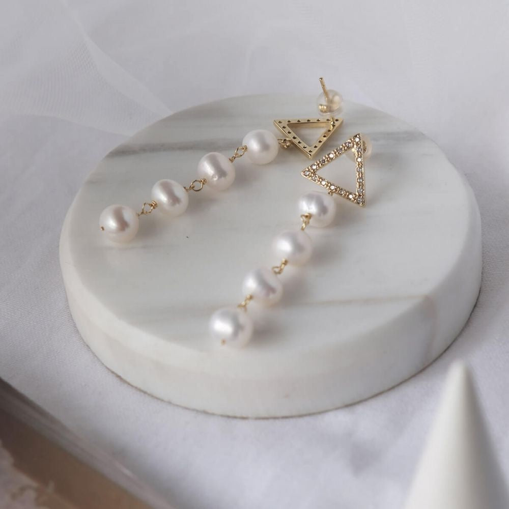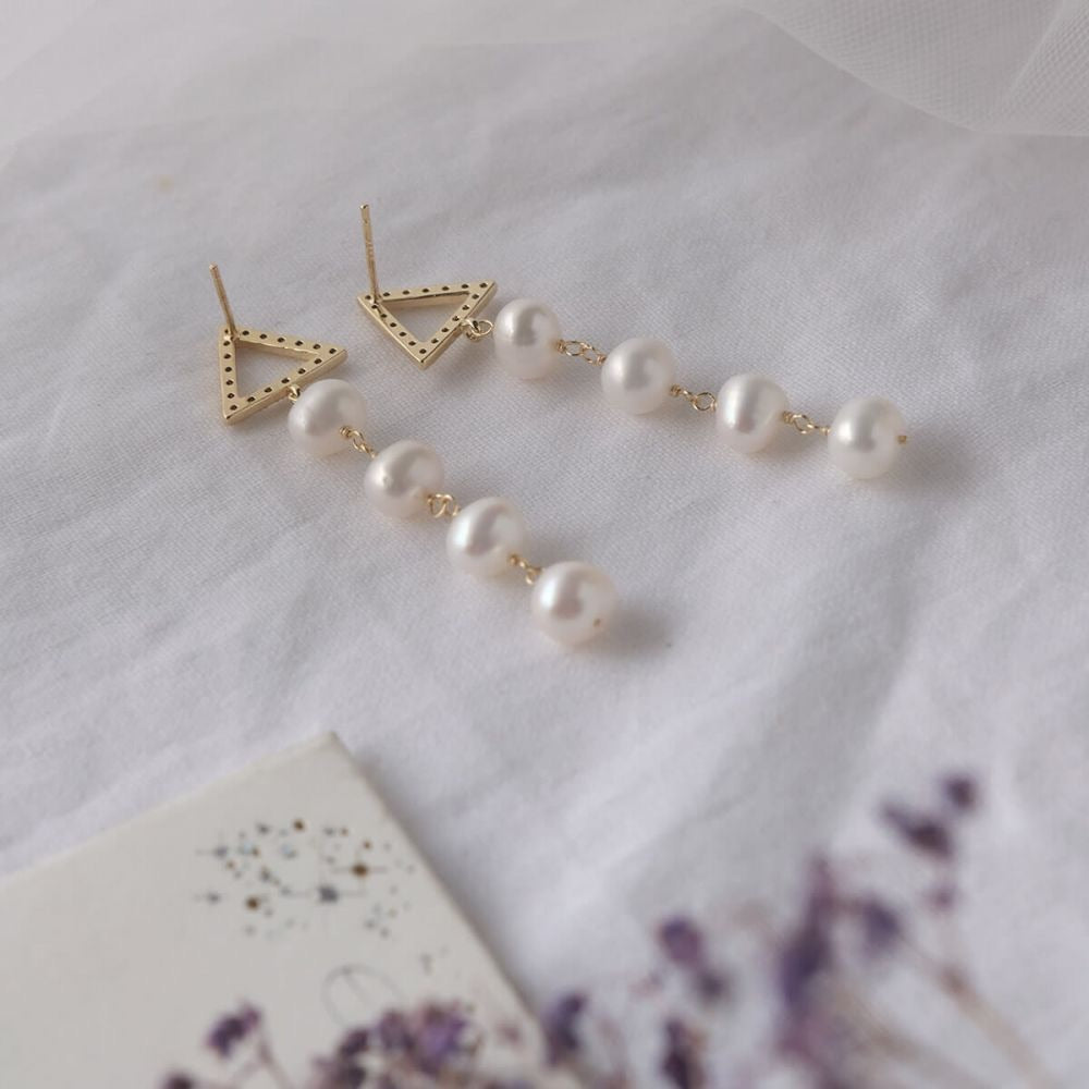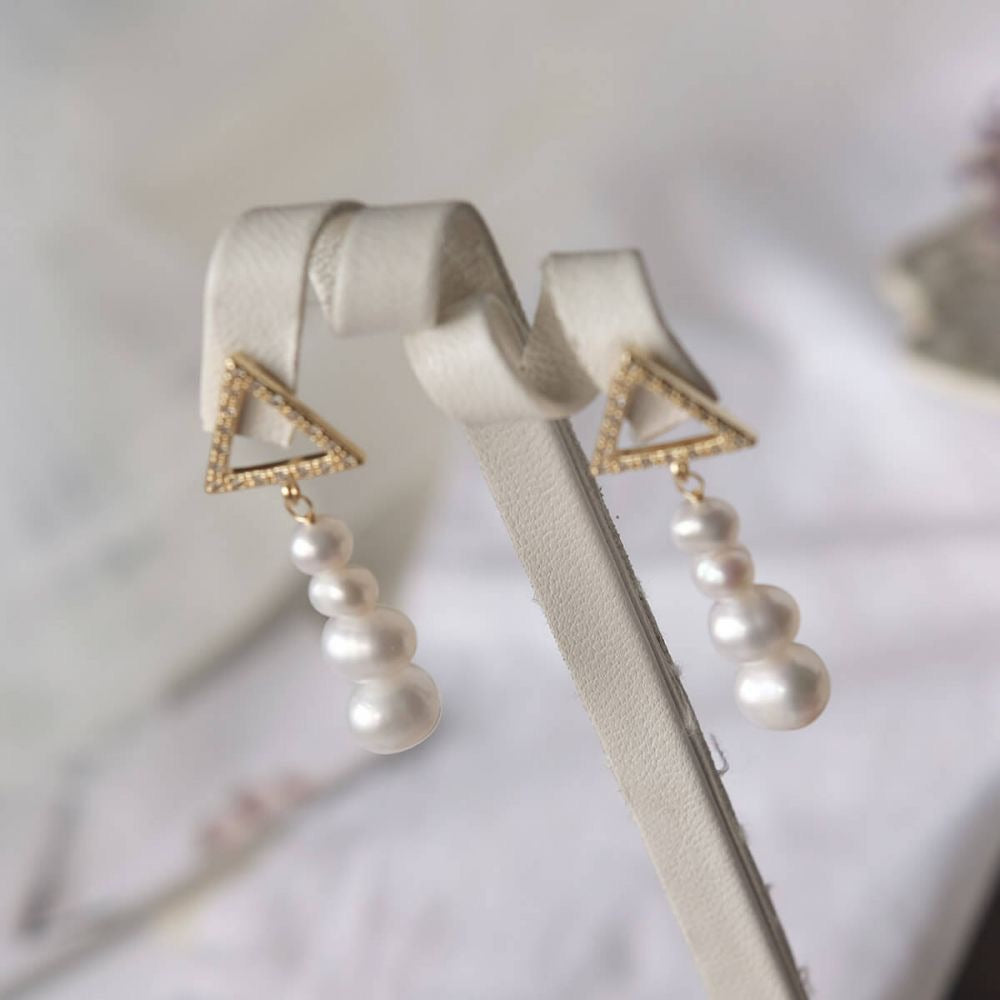 Rhinestone Inlaid Gold Plated Triangle Stud White Pearls Dangling Earrings