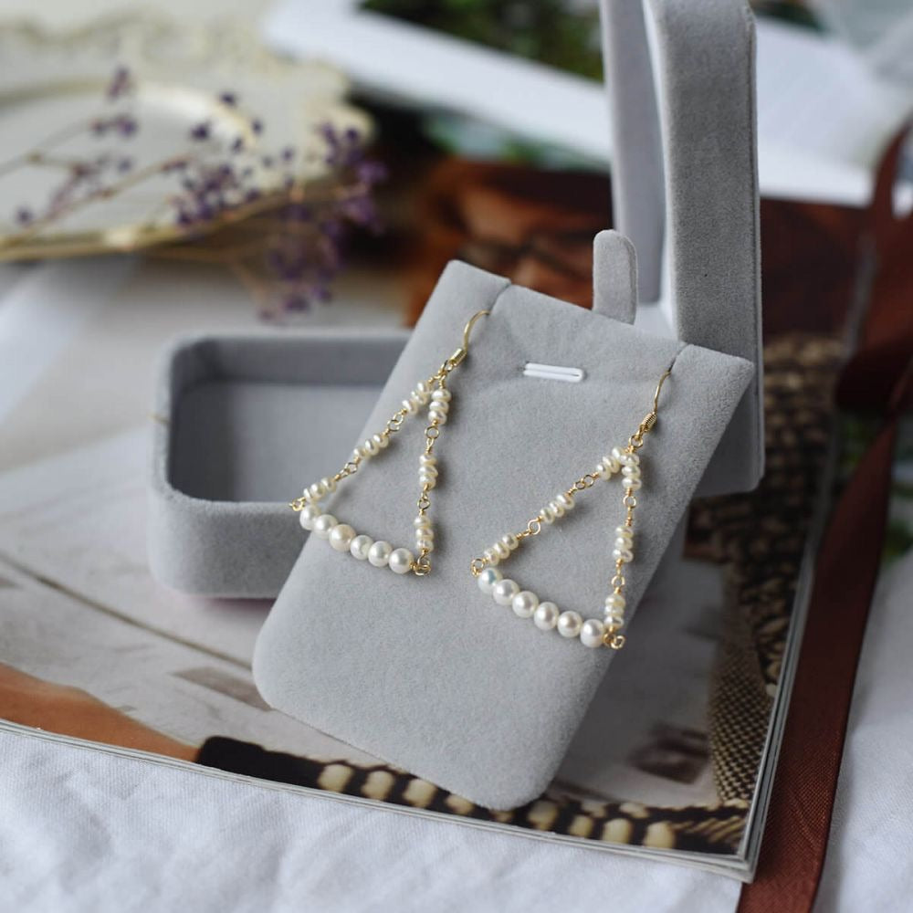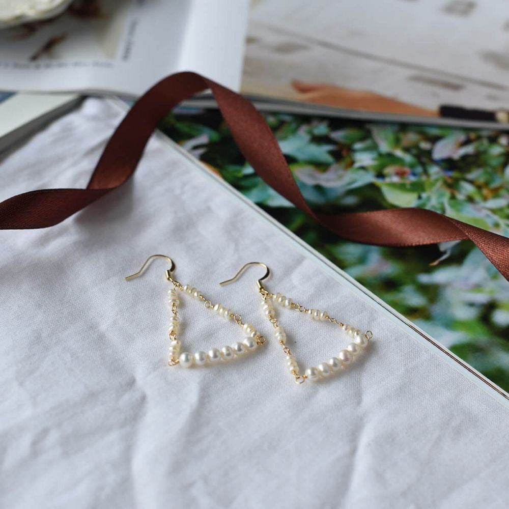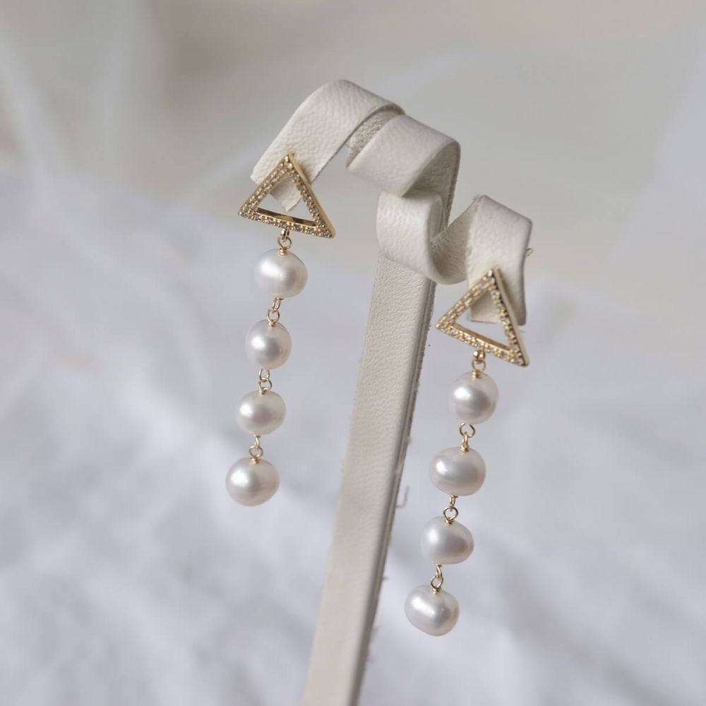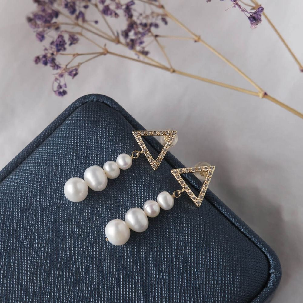 Rhinestone Inlaid Gold Plated Triangle Stud White Pearls Dangling Earrings